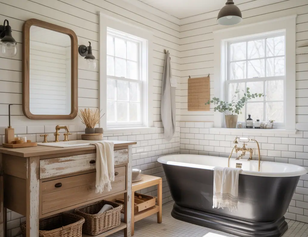 Install shiplap behind the vanity or tub for instant farmhouse character. For a budget-friendly DIY, use primed MDF shiplap panels that interlock—measure, cut with a circular saw, and nail to studs or a plywood backing. Finish with semi-gloss paint for moisture resistance.