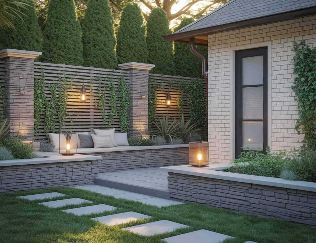 Combine masonry with timber caps, lighting, and planter boxes for a layered, custom look. Using multiple textures and heights creates visual interest and screens at the right levels.