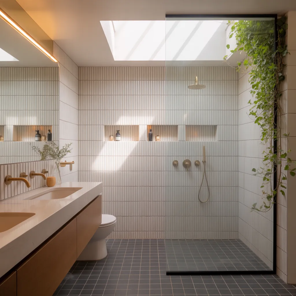 - Tile strategy: Large-format floor tiles, diagonal layouts, or vertical subway tile elongate the room.