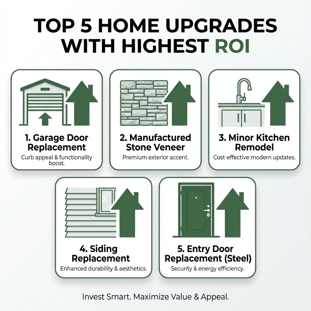 Based on recent data, exterior projects often lead the pack in ROI. Replacing your garage door (with a 194% ROI) and upgrading to a steel entry door (with a 188% ROI) are consistently among the highest-return-on-investment (ROI) options. Manufactured stone veneer (with a 153% ROI) also performs exceptionally well. Minor kitchen remodels (around 96% ROI) and deck additions (106.7% for wood, 68% for composite) are strong contenders for interior and outdoor spaces, respectively. Energy-efficient upgrades, such as new windows and attic insulation, also offer good returns through both increased value and reduced utility costs.