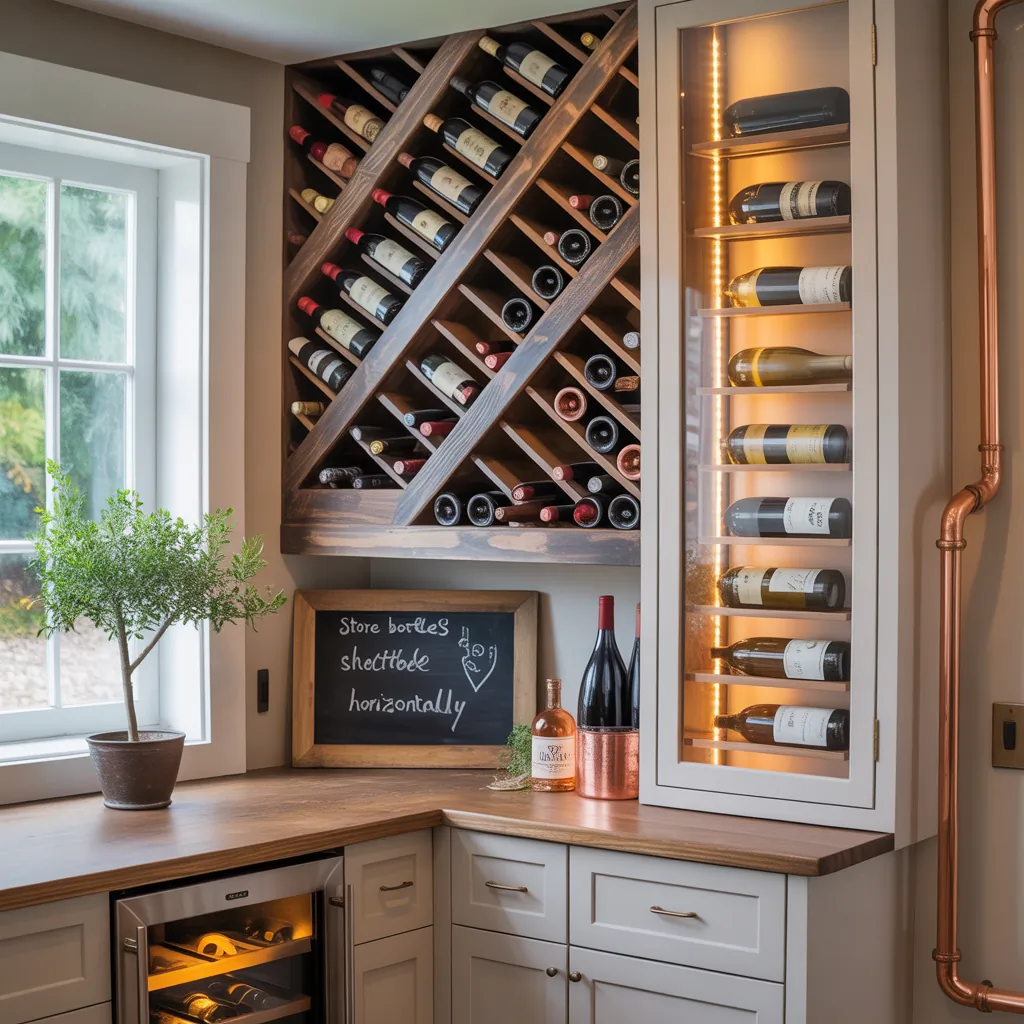 - Install simple slotted wine racks or build racks from plywood strips to hold bottles on their side.