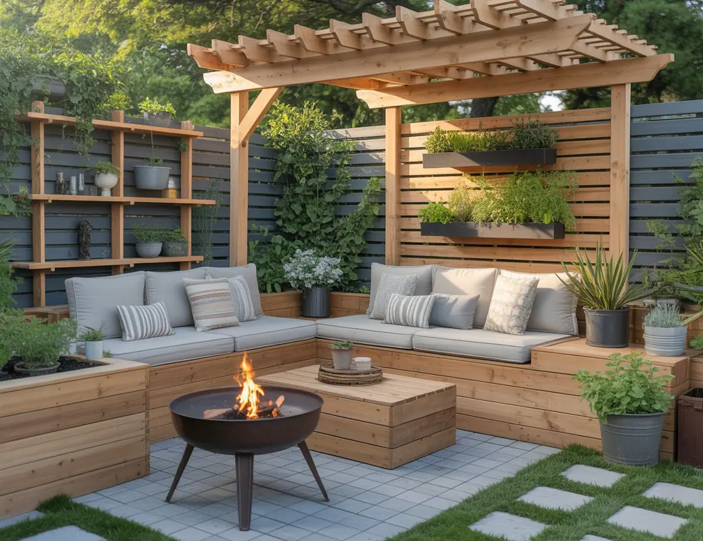 Create a snug patio (8–12 feet across) using interlocking pavers or gravel. Built-in bench seating along the perimeter saves space and provides storage beneath. Materials: pavers, landscape fabric, compacted gravel base, sand, and timber for bench framing.