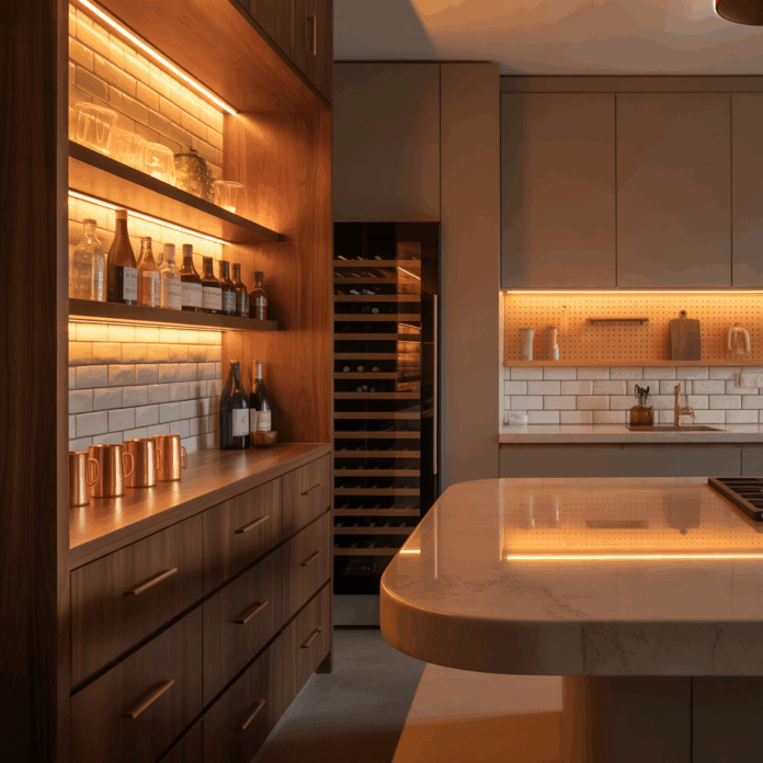 - Replace a cabinet run with a dedicated bar module featuring a wine fridge, stemware rack, and LED lighting.