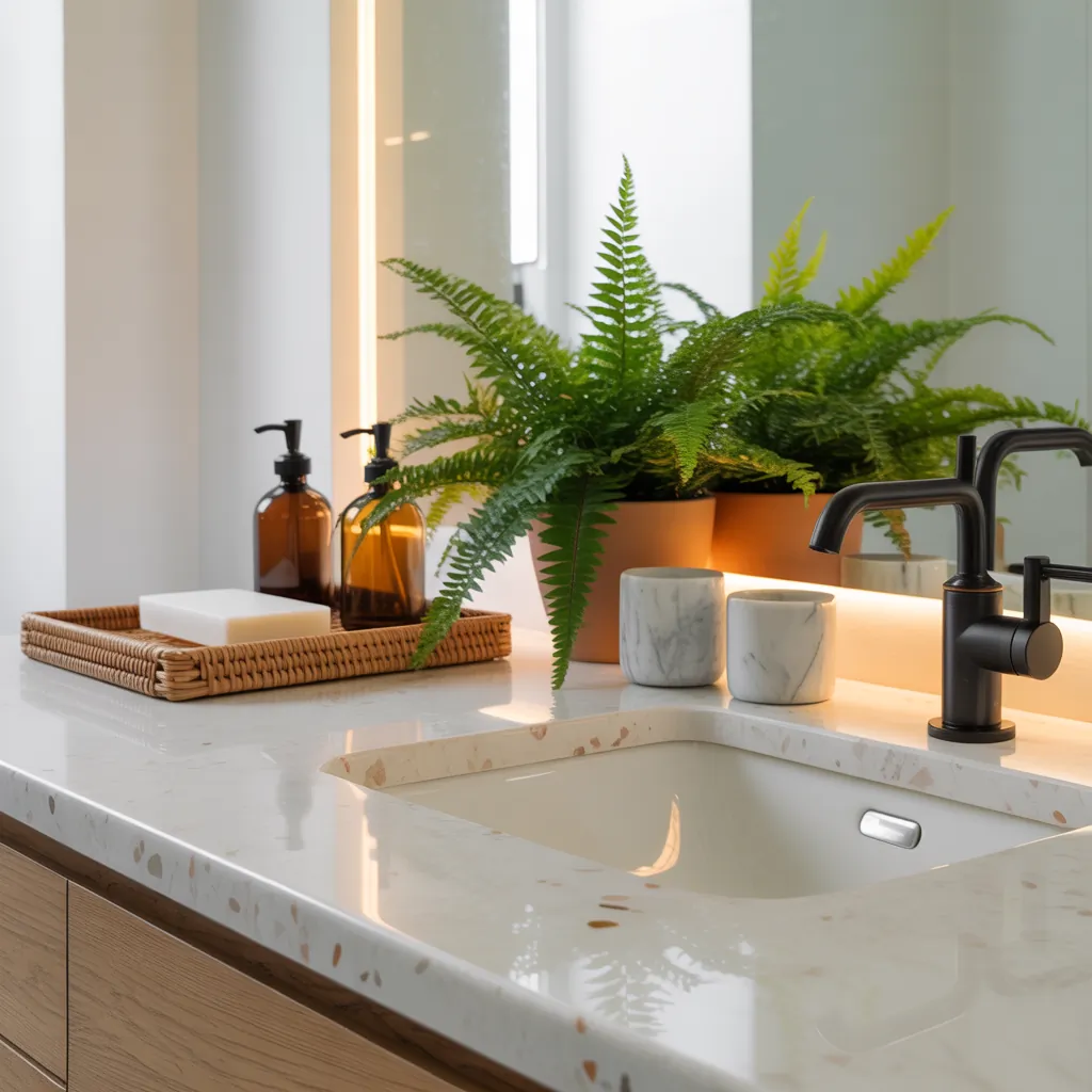 A: Quartz and sealed granite are excellent for moisture resistance. For décor, use waterproof trays, sealed wood, ceramic, or stainless steel. If you use porous materials, seal them properly and avoid standing water.