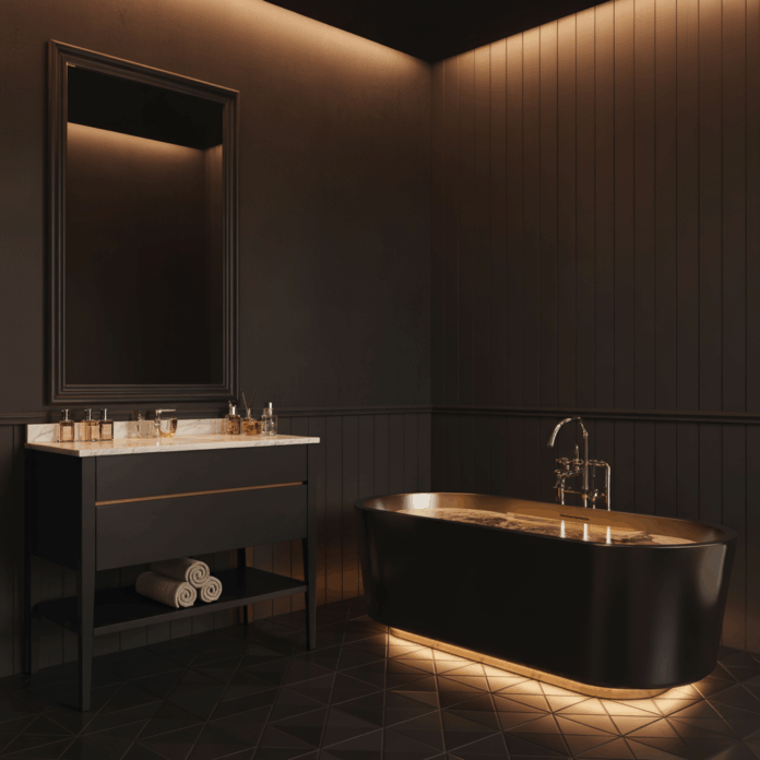 Transform walls quickly with paint. For small bathrooms, try a black accent wall behind the vanity; for larger rooms, a deep charcoal keeps it dramatic without absorbing light.