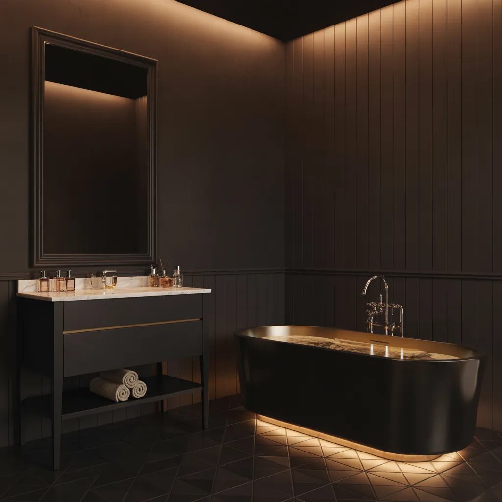 - Minimal Luxe: Matte black walls, thin gold-framed mirror, and minimalist black vanity.