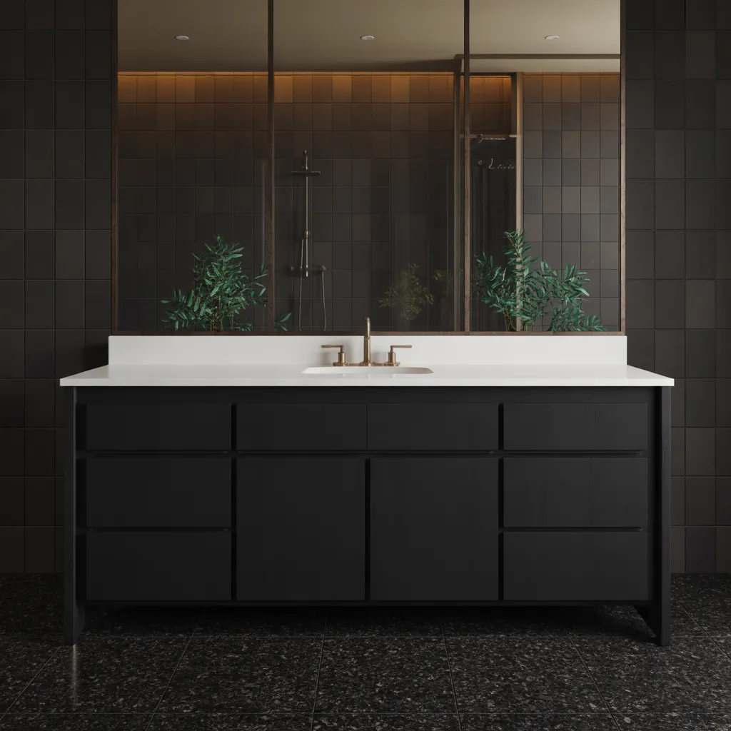 - Vanity & Fixtures: White vanities pop against black floors. Mix finishes — matte black taps for cohesion, brass or chrome for contrast.
