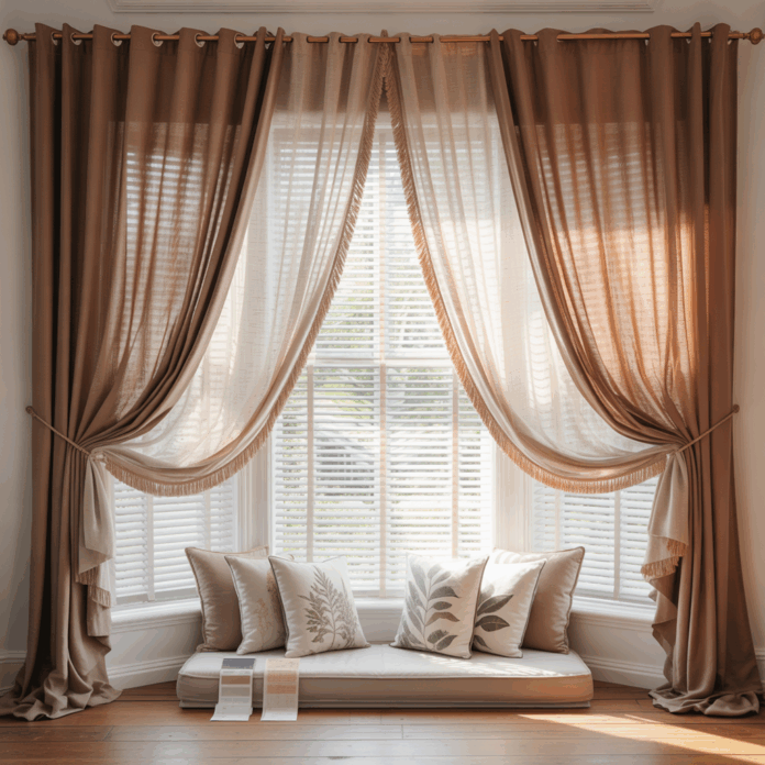 - Coordinate patterns and textiles with the room: if your bay has a lot of wood or built-ins, neutral curtains often complement rather than compete.
