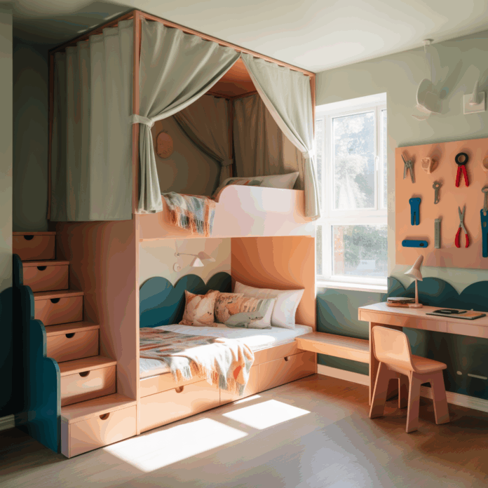 - Create a pull-out desk or a fold-down workstation at the foot of the lower bunk for homework and crafts.
