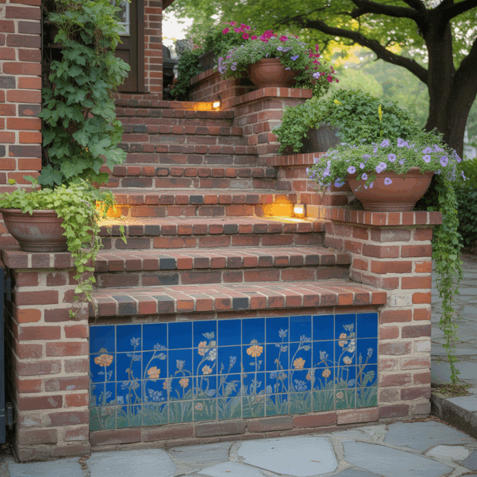 Combine brick risers with poured concrete treads or bluestone steps for a contemporary, high-contrast look. This works especially well when you want the warmth of brick but need a smoother walking surface.
