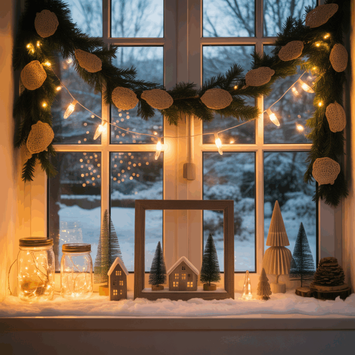 Simple designs are perfect for renters, small homes, or anyone who prefers a clean aesthetic. These straightforward Christmas window displays are quick to build, reuseable year after year, and often use items you already own — fairy lights, sprigs of greenery, mason jars, and paper. They work well for both indoor and outdoor-facing windows, and they can be adapted for small windows, bay windows, or large picture windows.