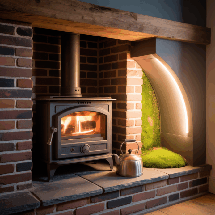 In compact homes, choose a compact corner stove model and a flush or low-profile hearth. Use reflective materials like light-colored tile or a mirrored backsplash to visually expand the room. Vertical storage for kindling keeps the floor clear. This approach preserves traffic flow while delivering efficient heat.