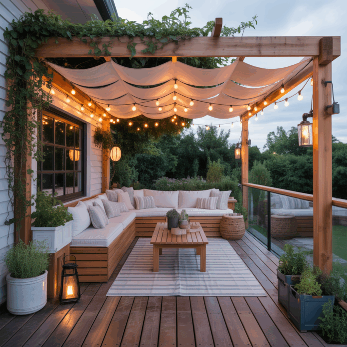 For cottage or farmhouse homes, a gazebo-style covered deck with exposed beams and natural wood evokes cozy charm. Add pendant lighting and a wood-burning fire pit (where allowed) for ambiance.