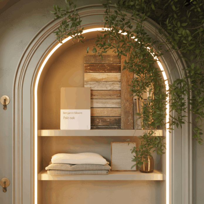 - DIY steps: Measure the niche depth → cut shelf to fit → install hidden brackets → style with books, plants, and ceramics.