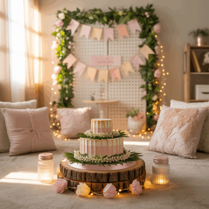Choose vertical décor (a slim backdrop or wall hanging), use foldable seating, and keep centerpieces low. A single focal point — like a decorated backdrop behind the seat of honor — makes a small room feel intentional and festive.