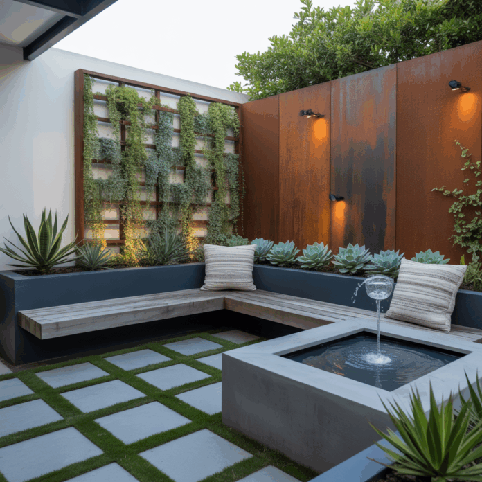 Modern outdoor corner garden design thrives on contrast—mix smooth concrete or corten steel with organic wood and textured plantings.