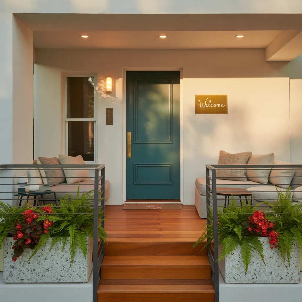 - Paint the door a statement color: Matte black, deep navy, or olive green pair well with modern palettes. Use high-quality exterior paint.