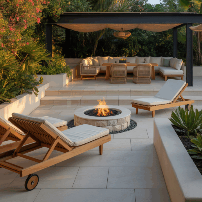 Anchor the layout with a focal point: a pergola, fire pit, large planter, or statement outdoor rug. Use symmetry for formal looks (matching pairs of chairs) or an L-shaped arrangement to create an inviting conversation area. Place dining near the kitchen door for convenience and lounging closer to the pool.