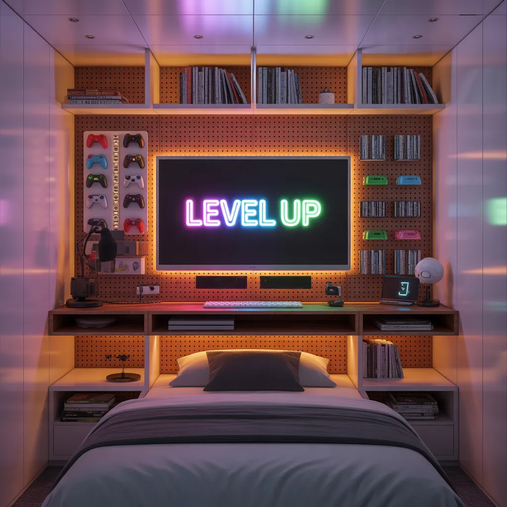 Raise your sleeping area to free up floor space. A loft or high bunk-style bed allows you to place a full-sized desk, storage, or a console nook beneath. This is ideal for PC builds, multiple monitors, or a console station plus a mini-fridge.