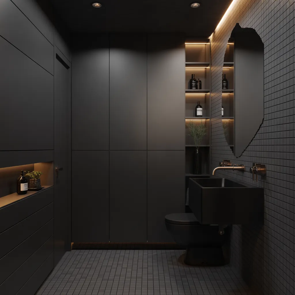 Not necessarily. When paired with good lighting, glossy surfaces, and contrasting light elements, black can actually add depth and sophistication to small bathrooms without making them feel cramped.