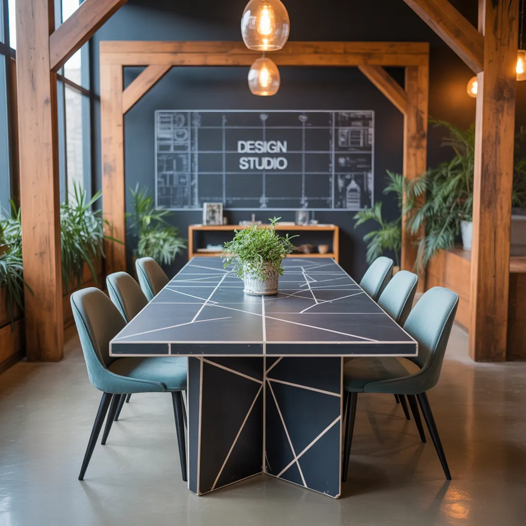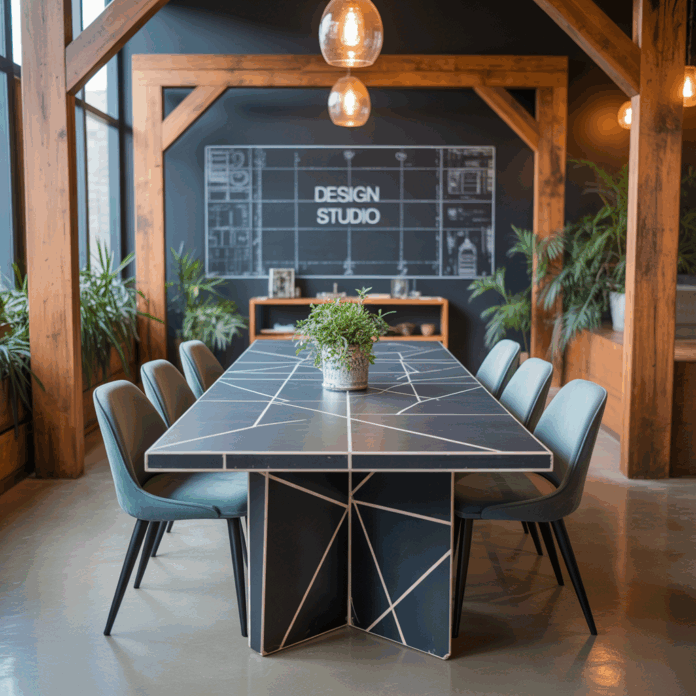 - Industrial: Metal-framed console that doubles as dining table, warm pendant light, and textured rug.
