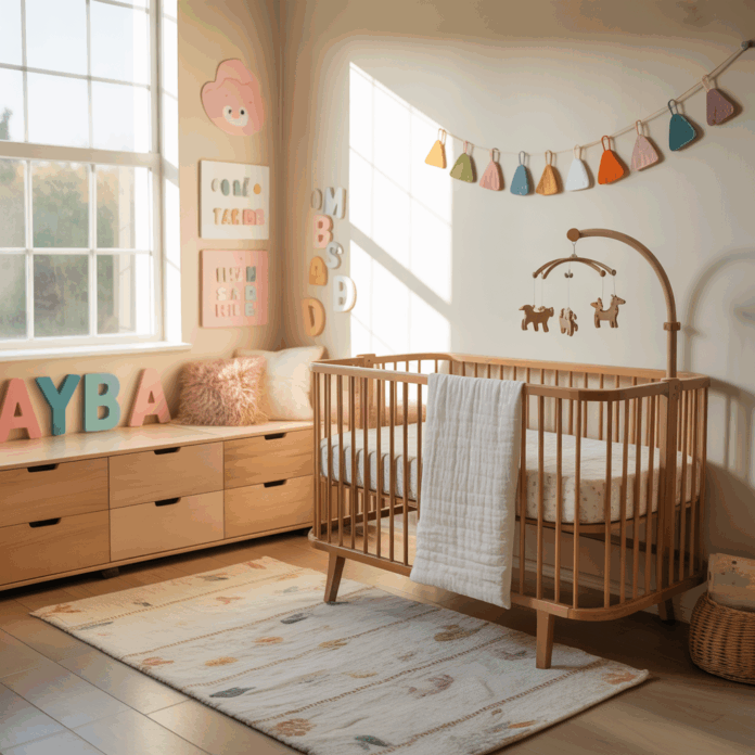Stick to soft, muted hues to promote sleep—sage, dusty blue, warm neutrals. Add a dimmable nightlight and blackout curtains for reliable nap times.
