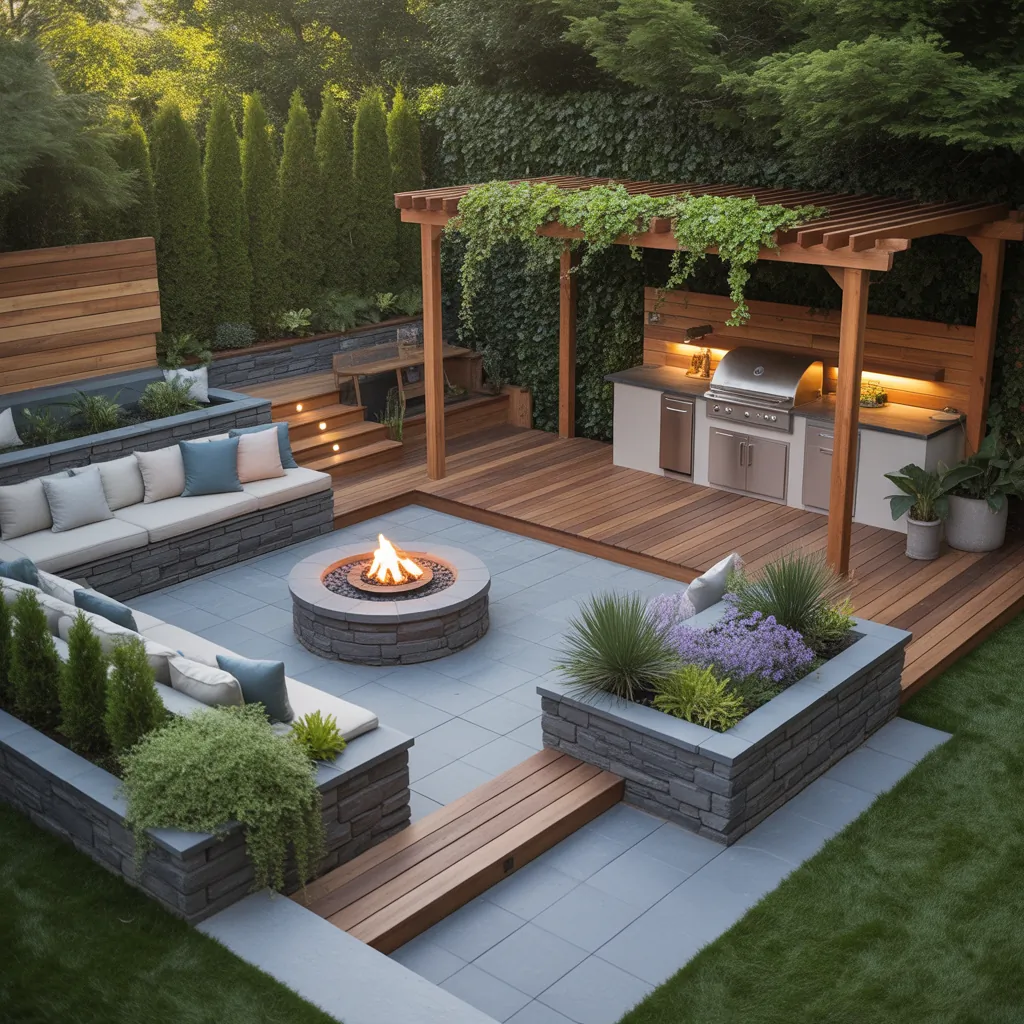 - Add a focal point: a fire pit, water feature, or statement planter.