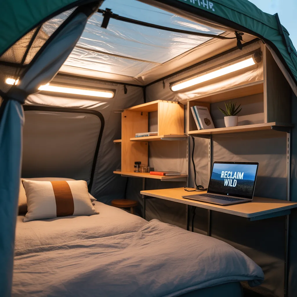 - Family camping: Large floor rug, multiple storage pockets, a central lighting hub, and bunk-style sleeping platforms.