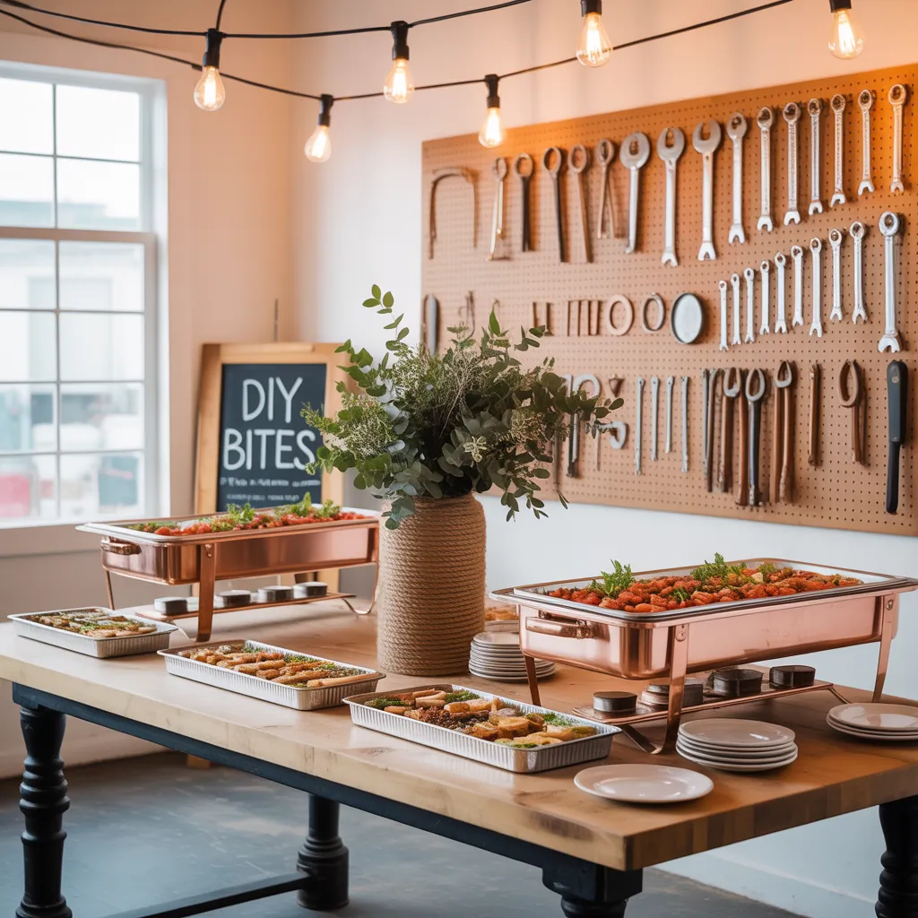 Mix reusable platters with stylish disposables for easy cleanup. Use warmed chafing dishes for hot items and insulated dispensers for beverages.