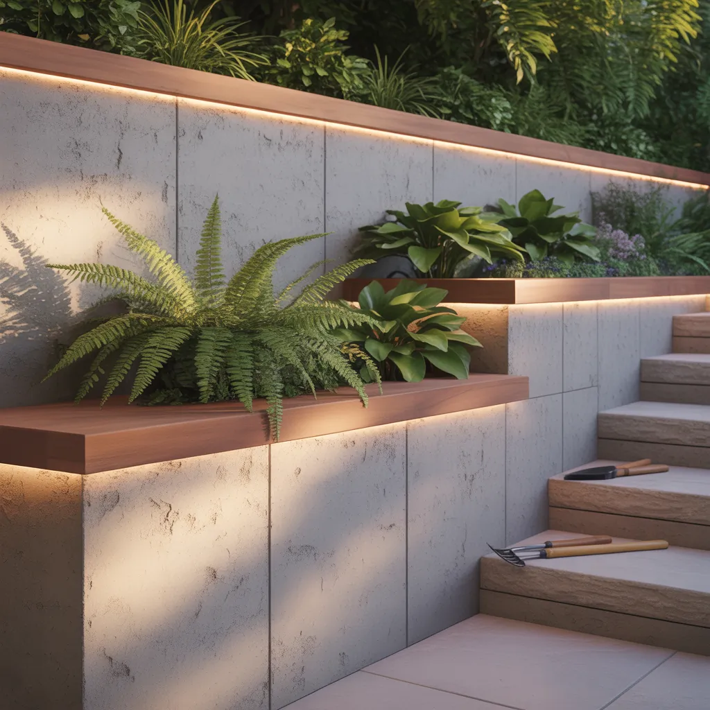 Clean, monolithic walls suit contemporary landscapes. Use formwork to pour a smooth concrete wall and finish with a sealer. Add LED strip lighting near the top for evening ambiance.