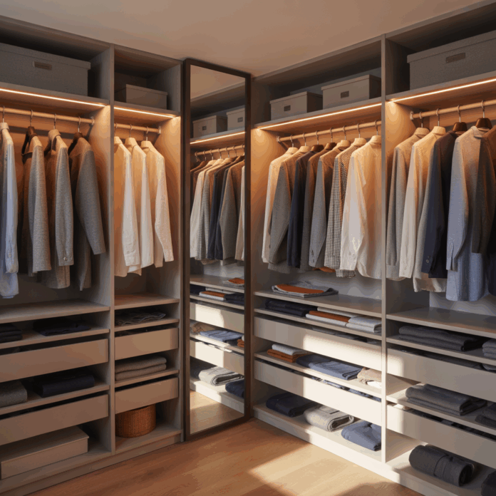 - Optional: shelving units, baskets, slim hangers, LED lighting