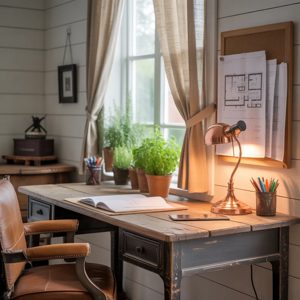 - Statement pendants: Metal or glass pendants over the desk add farmhouse character.