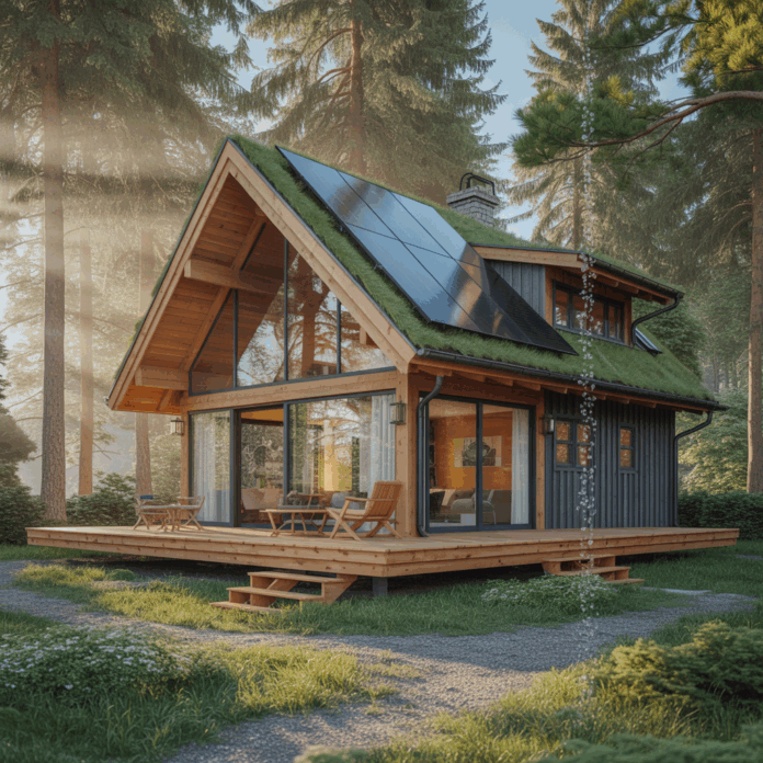 - Modern cabin: dark-stained siding, large windows, minimal decor.