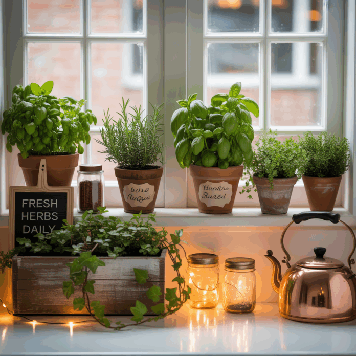 Attach mason jars to a narrow wooden board that fits the sill or simply line jars up. Use labeled tags for each herb. This is a budget-friendly kitchen windowsill decor idea that’s both charming and practical.