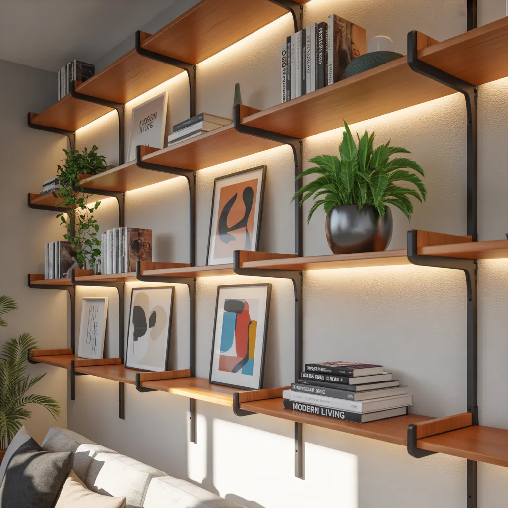 Create depth by installing several shelves at varying heights and lengths. Use mixed materials — reclaimed wood planks with matte black metal brackets — to balance warmth and industrial edge. This layout works well behind a sofa or beside a fireplace.