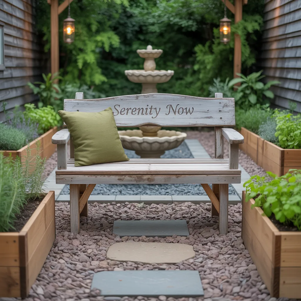 - Materials: raked gravel or decomposed granite, smooth river stones, a simple bench or flat stepping stones.