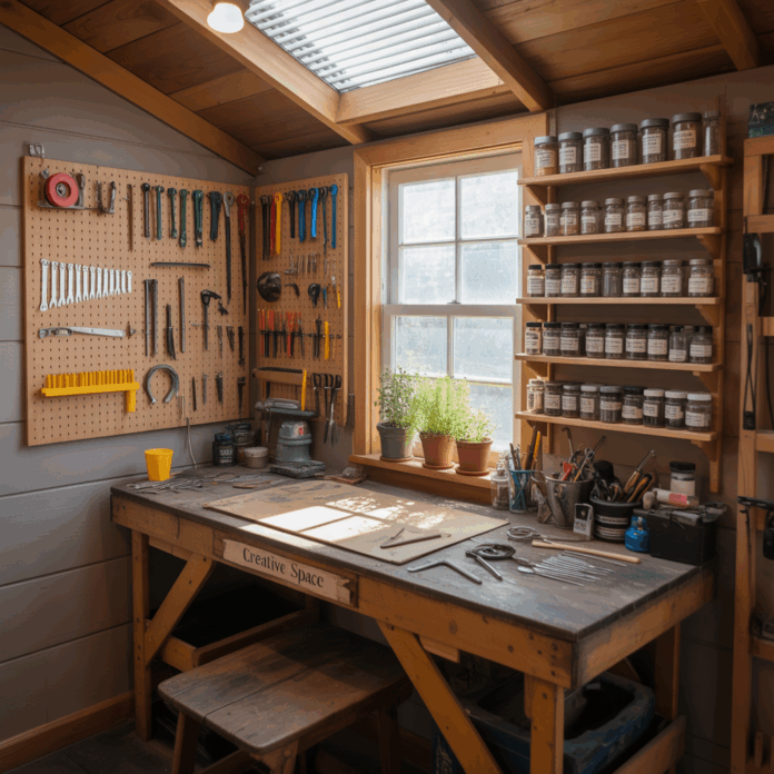 Designate zones: a potting counter with soil storage bins beneath and another wall for tool hookups. Use clear jars for seeds and labeled drawers for small supplies.