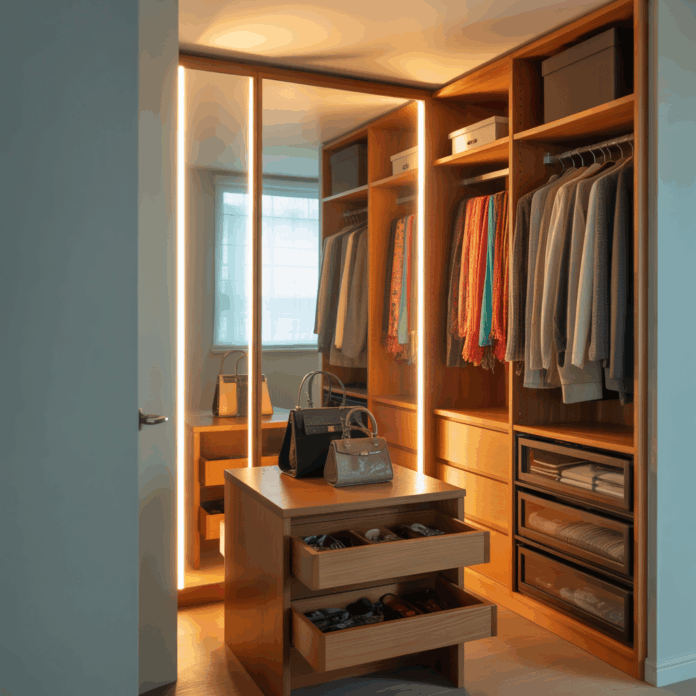 - Neutral paint or light wallpaper: A light color scheme keeps the closet airy; a subtle pattern can add personality.