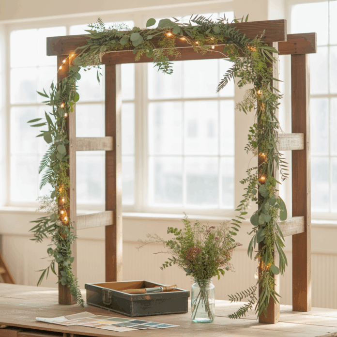 - Rustic wedding arch ideas: reclaimed wood, burlap accents, and wildflower garlands.
