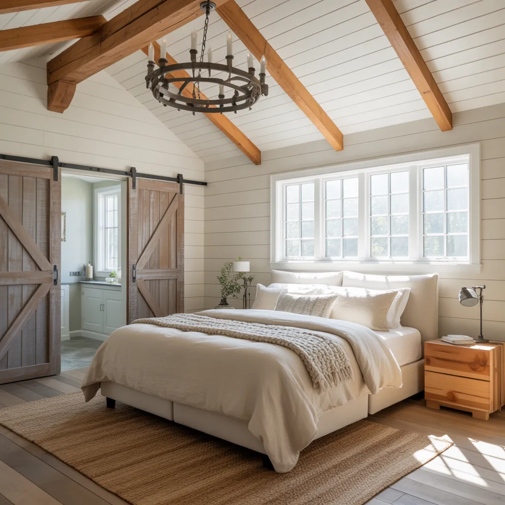 An accent wall behind the bed instantly anchors the room. Shiplap, beadboard, or reclaimed wood boards add farmhouse character without overwhelming the space.