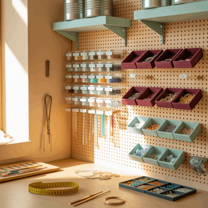 Pegboards let you add hooks, small shelves, and bins. It’s ideal for mixing necklaces and bracelets without tangling. Paint the pegboard to match your decor.