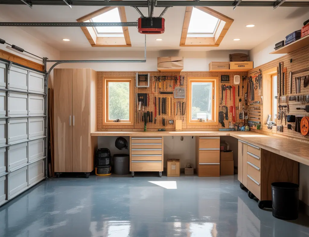 - Install lighting: Replace dim bulbs with bright LED fixtures. Add task lighting over workbench areas.