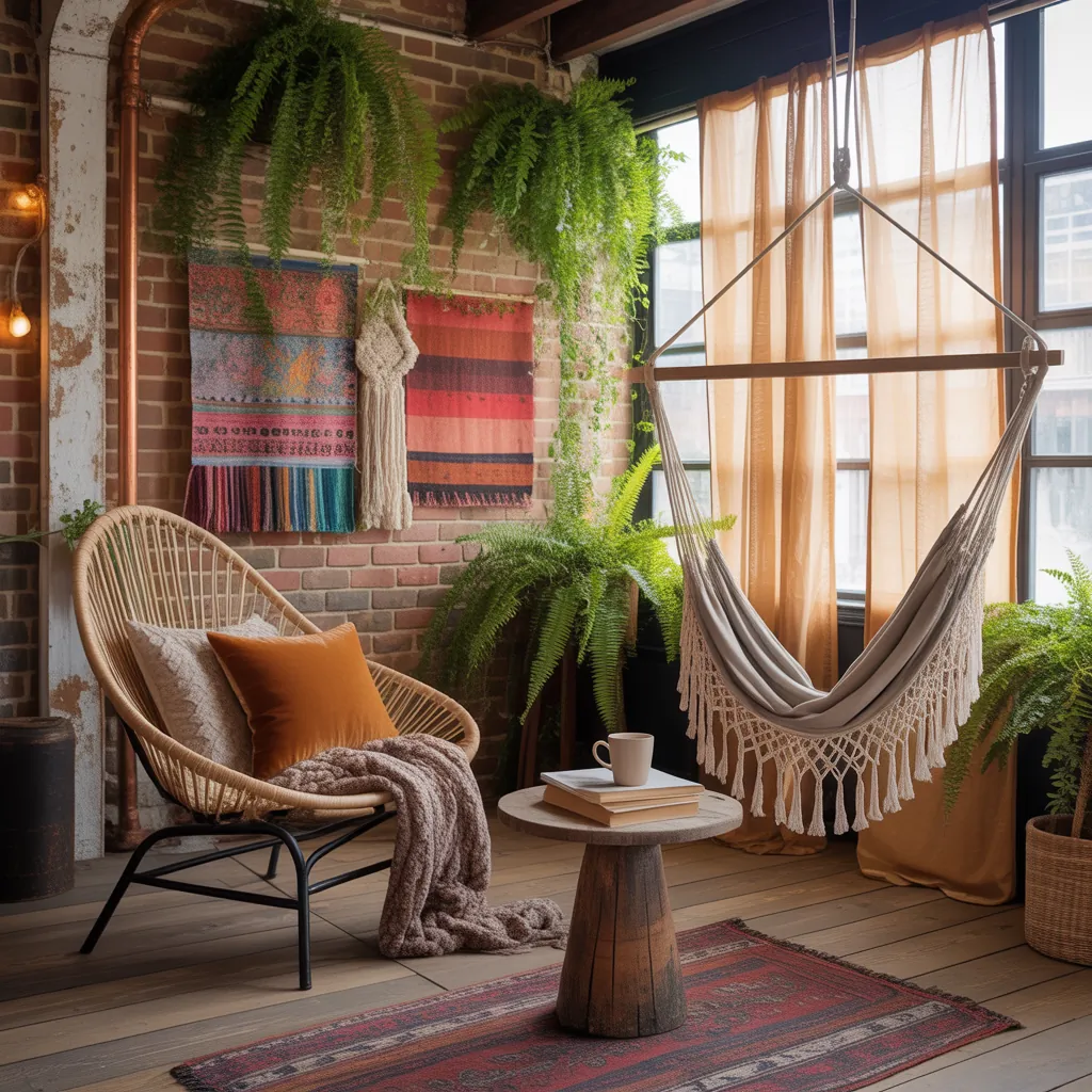 - Textures: Natural fiber rugs, rattan, woven baskets, and linen curtains are key to bohemian loft design.