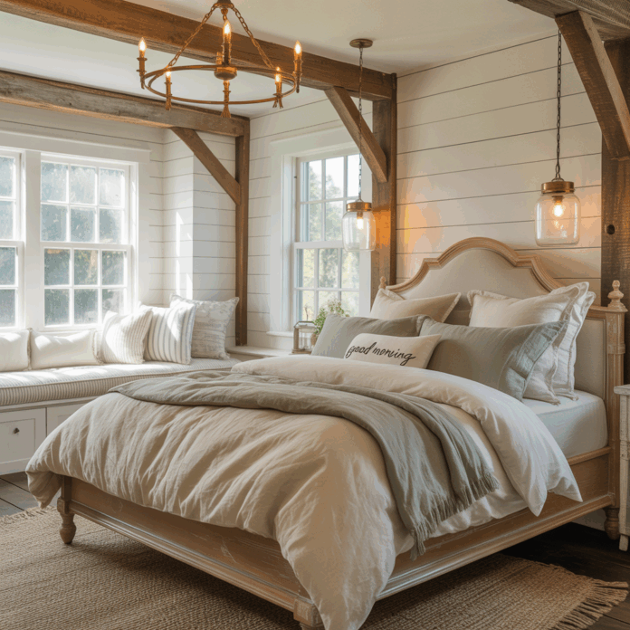 Farmhouse style blends rustic elements with modern comfort — think reclaimed wood, shiplap walls, barn door hardware, and cozy neutral palettes. It’s perfect for homeowners who want a peaceful master suite that feels warm and intentional rather than fussy. Whether you aim for a modern farmhouse master bedroom, a classic rustic master suite, or a light and airy cottage vibe, farmhouse decor adapts well to different budgets and skill levels.