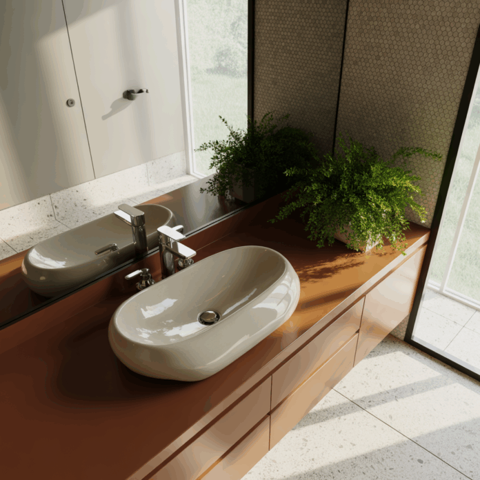 - Mid-century: tapered wood vanity, geometric tile, brass hardware.