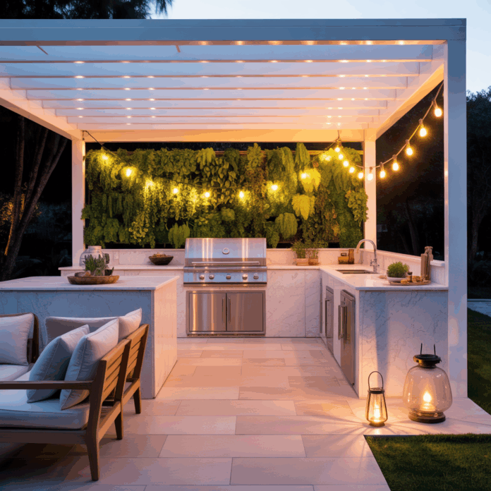 - Choose durable materials: For modern looks, consider aluminum or pressure-treated wood for the pergola, stainless steel appliances, and porcelain or concrete counters.