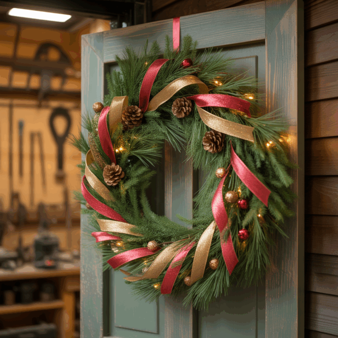 Short on time? Buy a premade evergreen ring, secure a large pre-tied red velvet bow to one side, and hot-glue a handful of gold ornaments and a few berry sprays. This fast method gives maximum impact with minimal effort — perfect for last-minute entertaining.