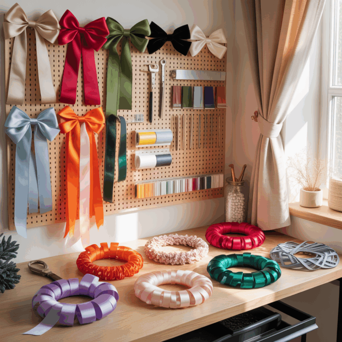 - Materials: assorted ribbons (satin, grosgrain, velvet, burlap), fabric glue, hot glue gun, scissors, pins, small nails.
