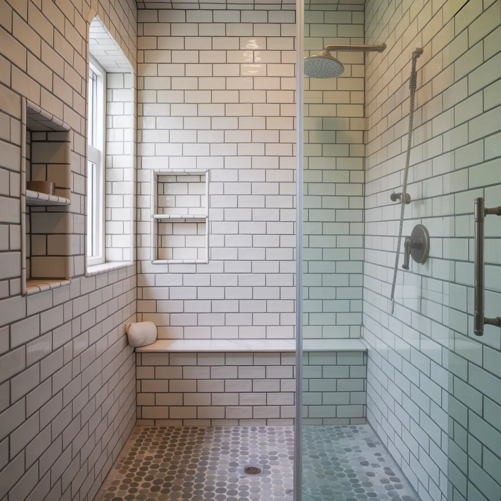 While large wall tiles work well, choose smaller mosaics or penny rounds for the shower floor for better traction. Match grout color carefully; lighter grout will hide soap scum less than darker grout.