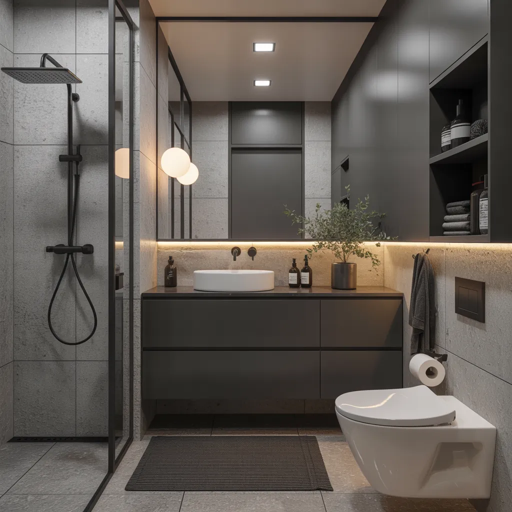 Opt for light, neutral hues like soft whites, pale grays, or pastel shades to open up the space visually. Reflective surfaces such as high-gloss tiles, mirrors, and glass shower doors bounce light around the room, making it appear larger. Consider incorporating a statement wall with subtle patterns or textures to add personality without overwhelming the space.